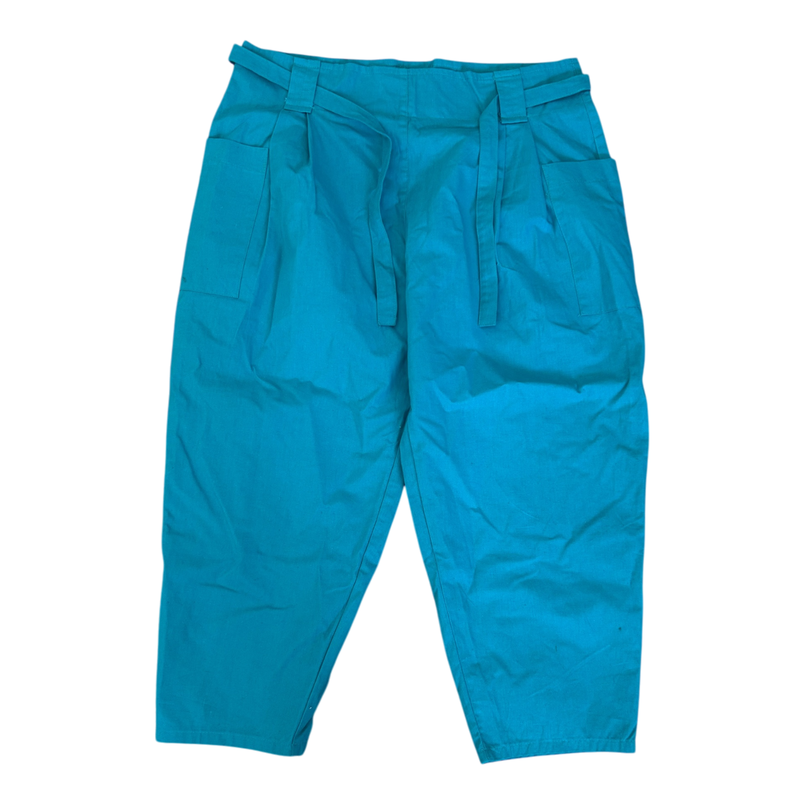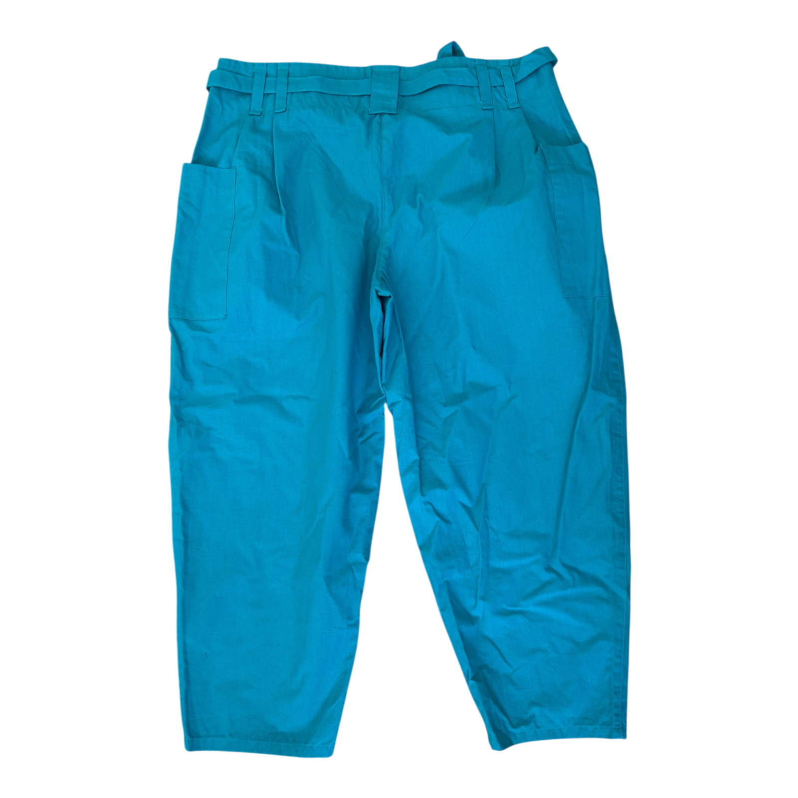 Diese weite Damenhose in einem schönen Türkis-Blau bietet maximalen Tragekomfort und Bewegungsfreiheit. Der elastische Bund mit Gürtelschlaufen und die lockere Passform machen sie ideal für entspannte Freizeitoutfits oder einen lässigen Streetwear-Look. Die Bundweite beträgt 48 cm, also weiter als die angegebene Größe 40.