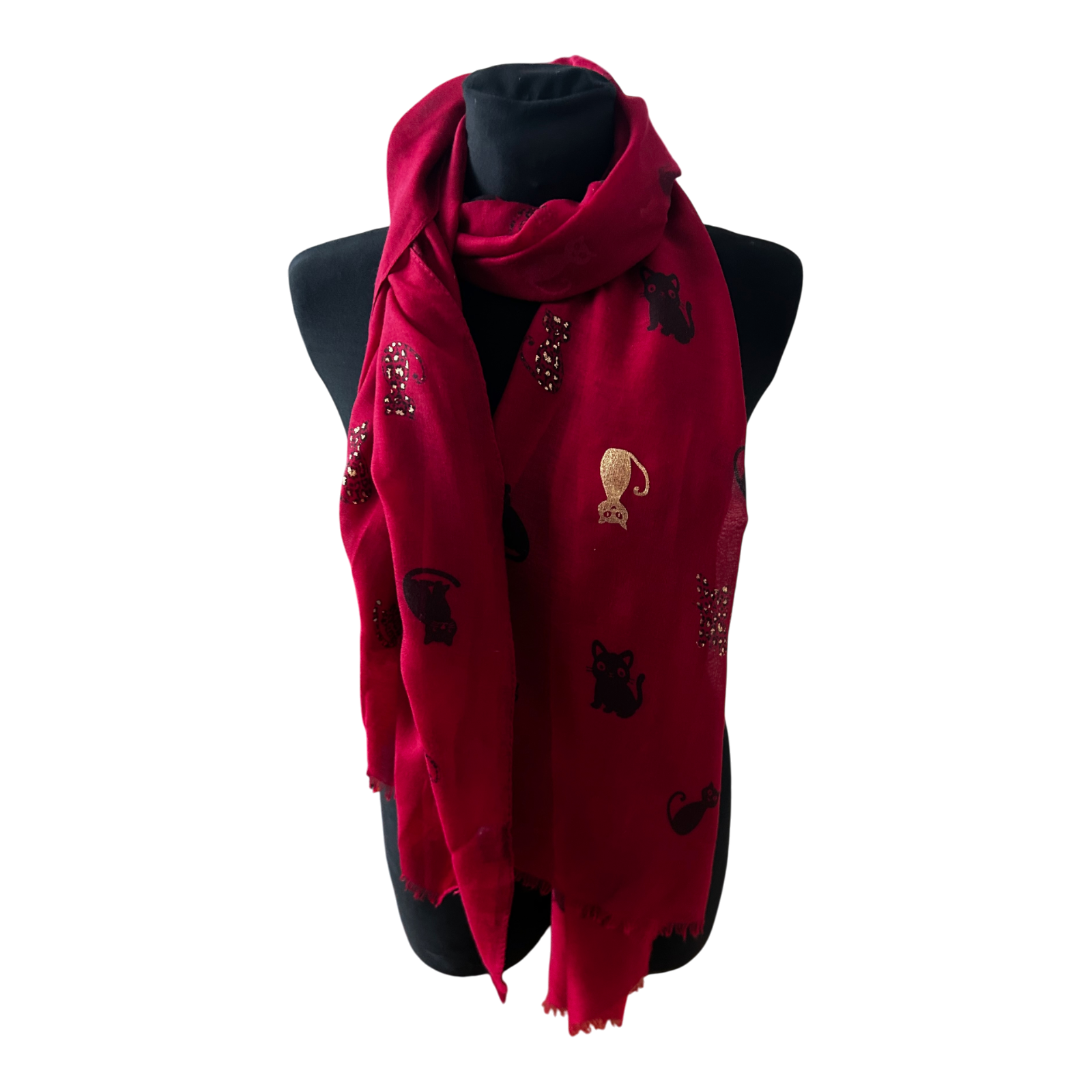 Dieser wunderschöne Katzenschal ist ein echter Hingucker und verbindet verspieltes Design mit eleganter Ausstrahlung. Auf dem kräftig roten Grund zeigen sich stilisierte Katzenmotive in Schwarz und Gold, ergänzt durch kleine dekorative Akzente.