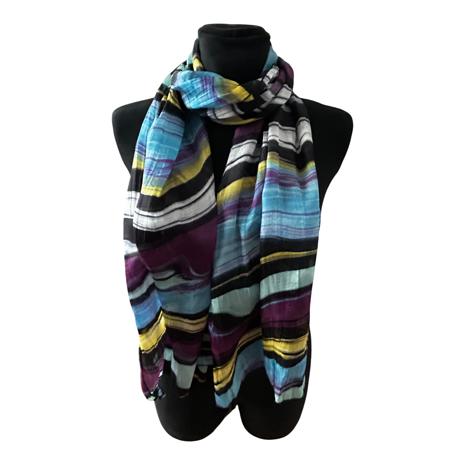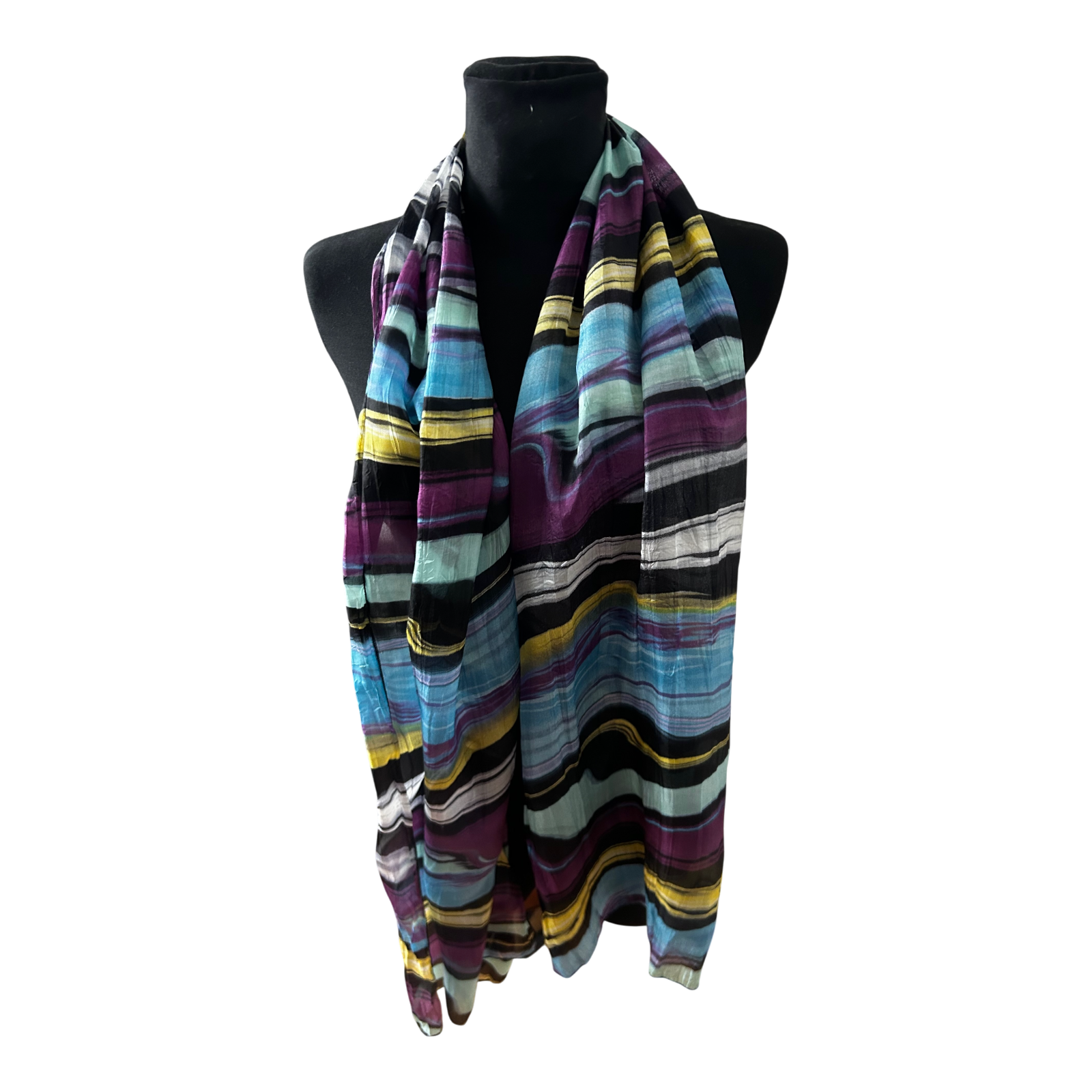 Dieser wunderschöne Seidenschal besticht durch sein ausdrucksstarkes Streifenmuster in harmonischen Farben wie Türkis, Lila, Gelb, Schwarz und Creme. Das Material ist angenehm leicht, weich und fließend und eignet sich ideal als elegantes Accessoire für jede Jahreszeit.