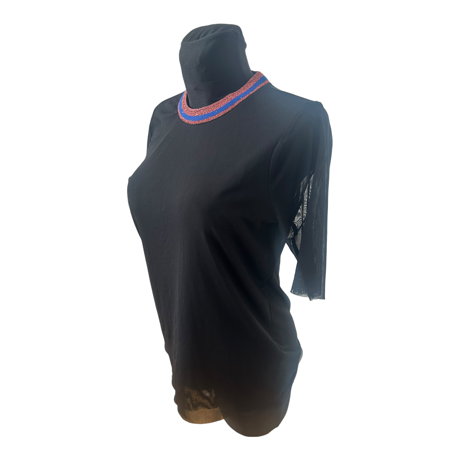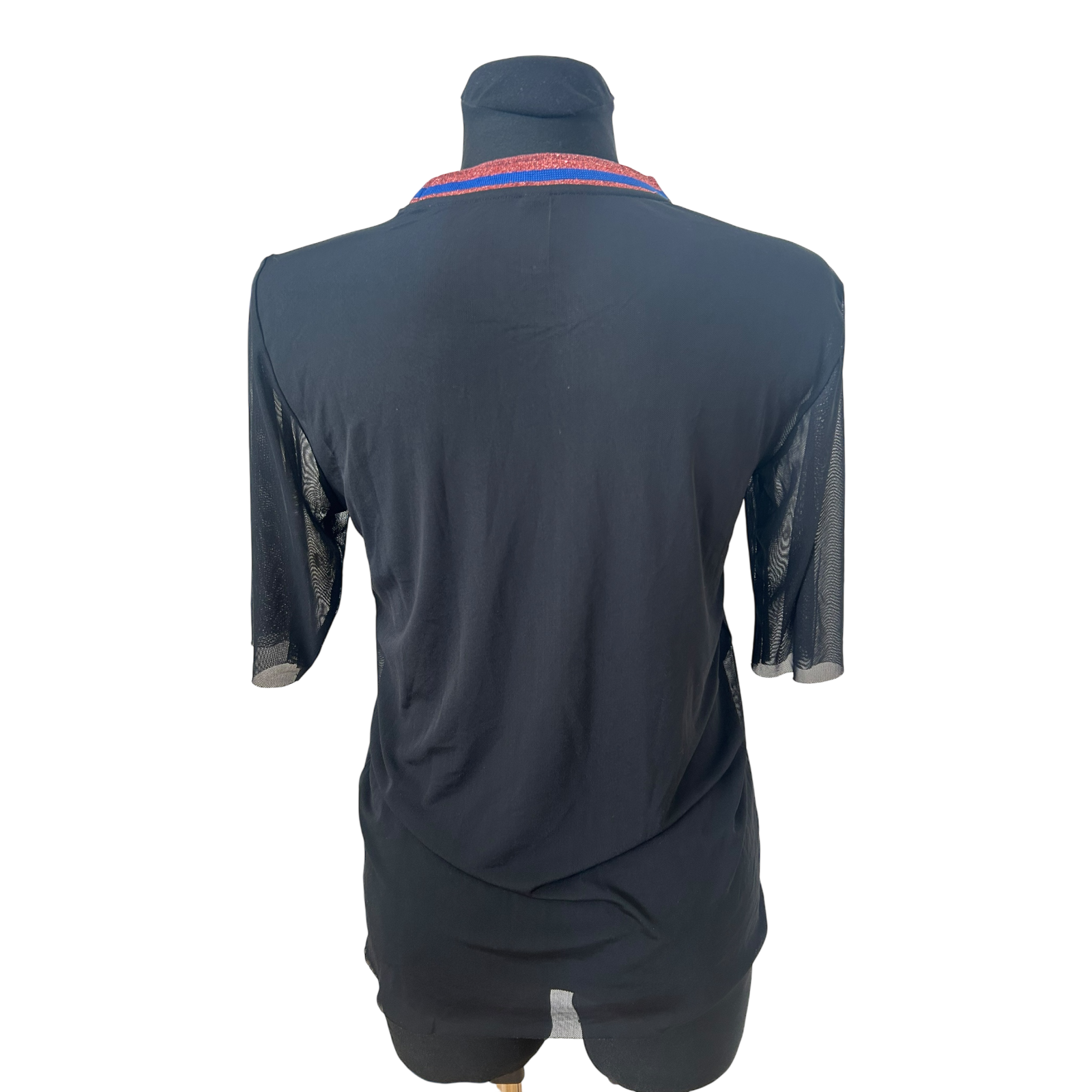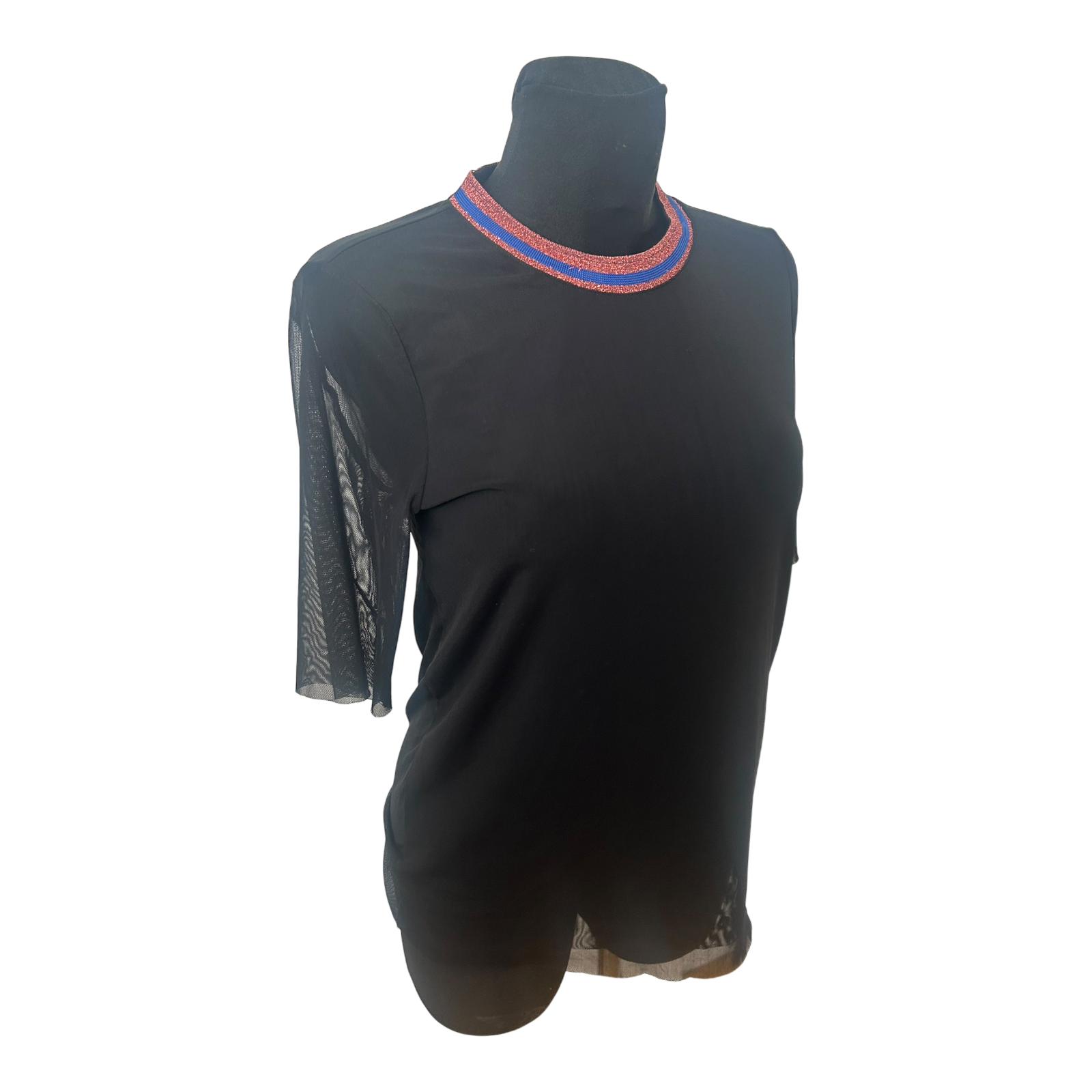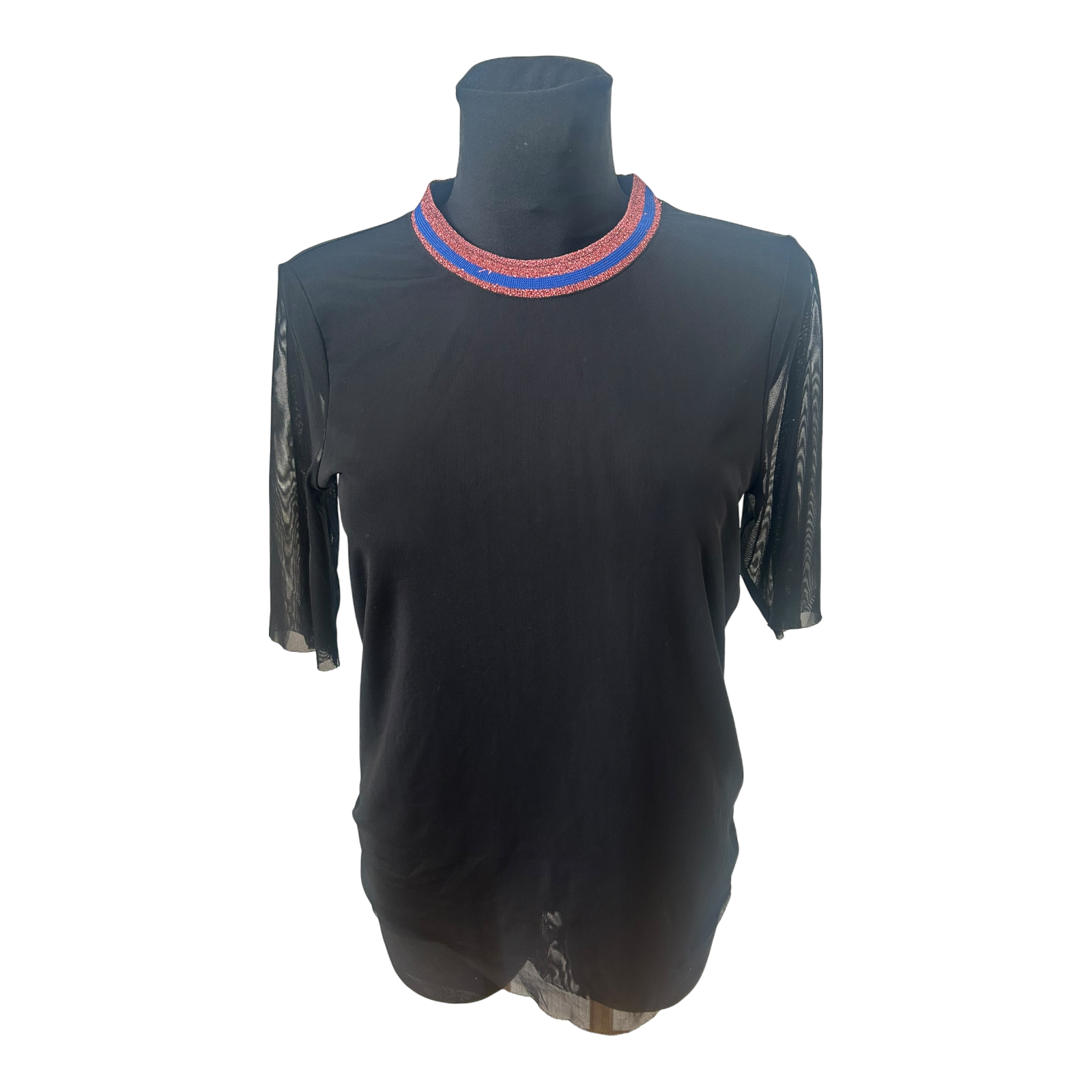 Sehr schönes transparentes Damen-Shirt von YAS in Größe M in klassischem Schwarz. Das Modell wirkt edel und modern und eignet sich perfekt zum Ausgehen oder für besondere Anlässe. Besonders auffällig ist der fein schimmernde Glitzerkragen in Rot- und Blaunuancen, der dem Shirt einen modischen Akzent verleiht ✨