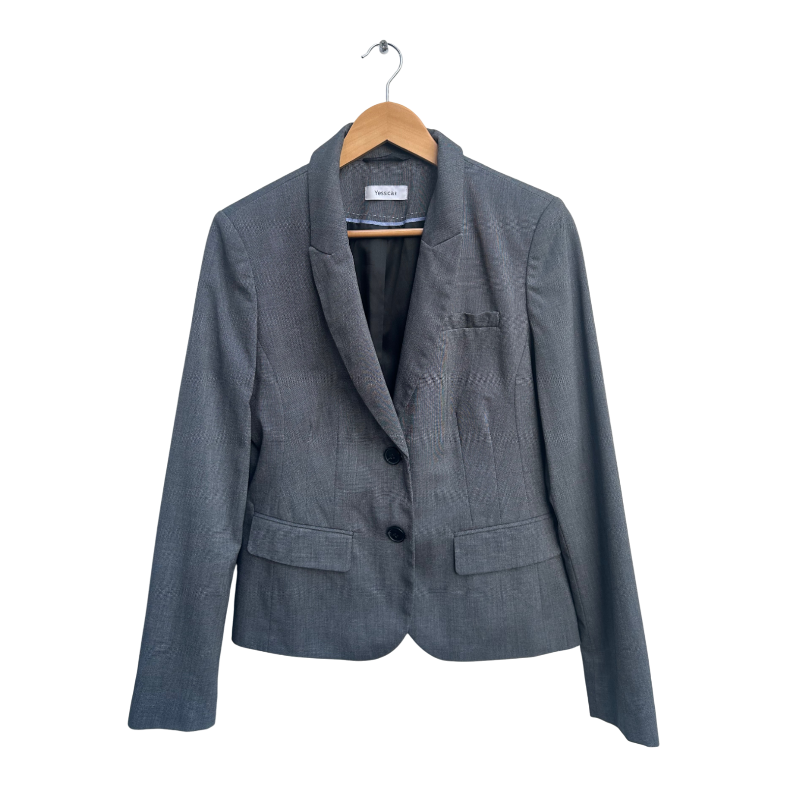 Blazer der Marke Yessica in klassischem Grau. Das Modell ist in Größe 40 gearbeitet und hat eine Brustweite von 49 cm, eine Länge von 60 cm und eine Ärmellänge von 64 cm. Das Materialetikett fehlt, die Qualität ist jedoch hochwertig und angenehm im Griff. Der Blazer besticht durch seine taillierte Form und die zwei Knöpfe vorne, wodurch er sich sowohl fürs Büro als auch für elegante Anlässe perfekt eignet. ✨👩💼