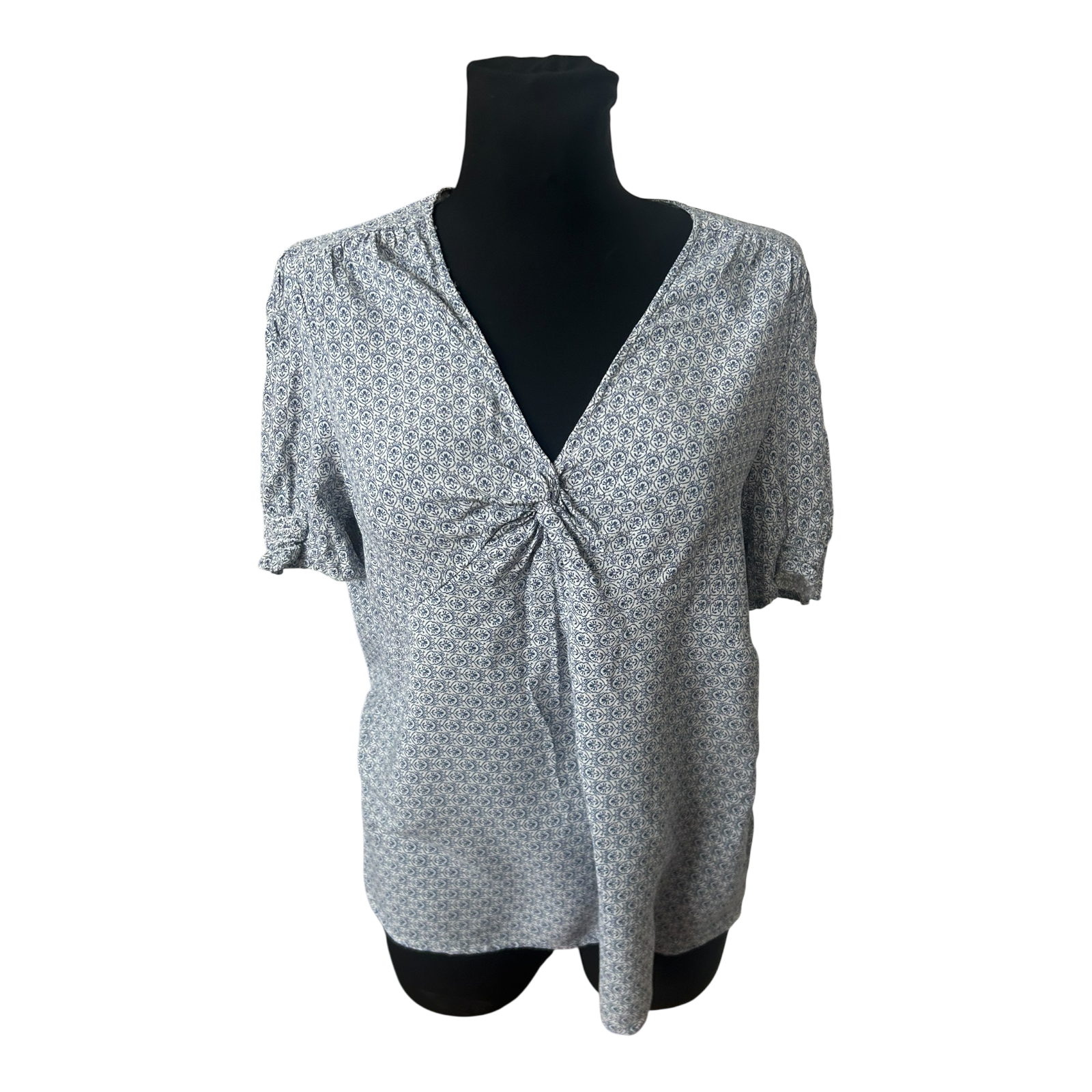 Yessica Damen Bluse Größe 42 Blau Weiß Muster Kurzarm Sommer Viskose Casual
