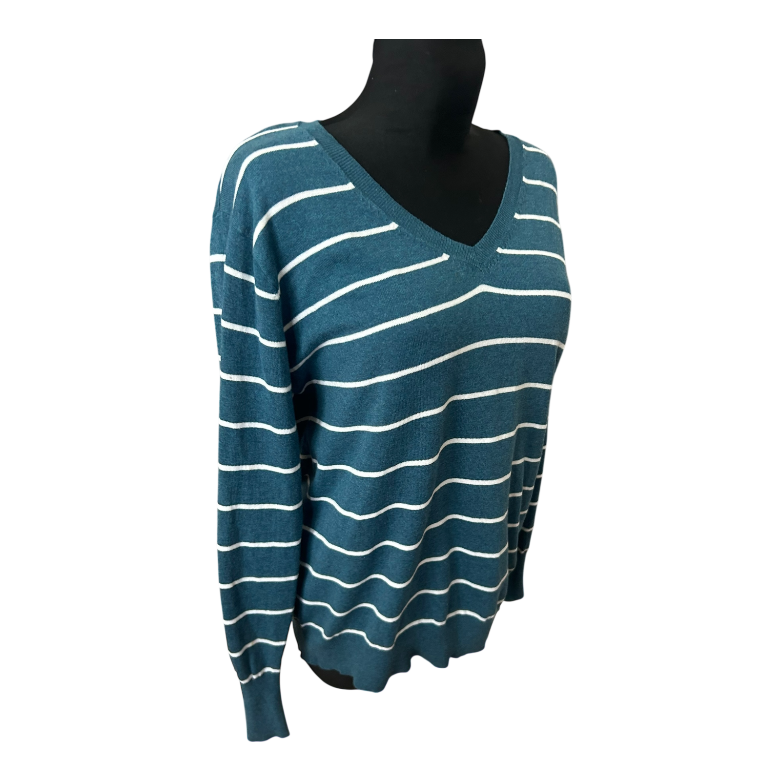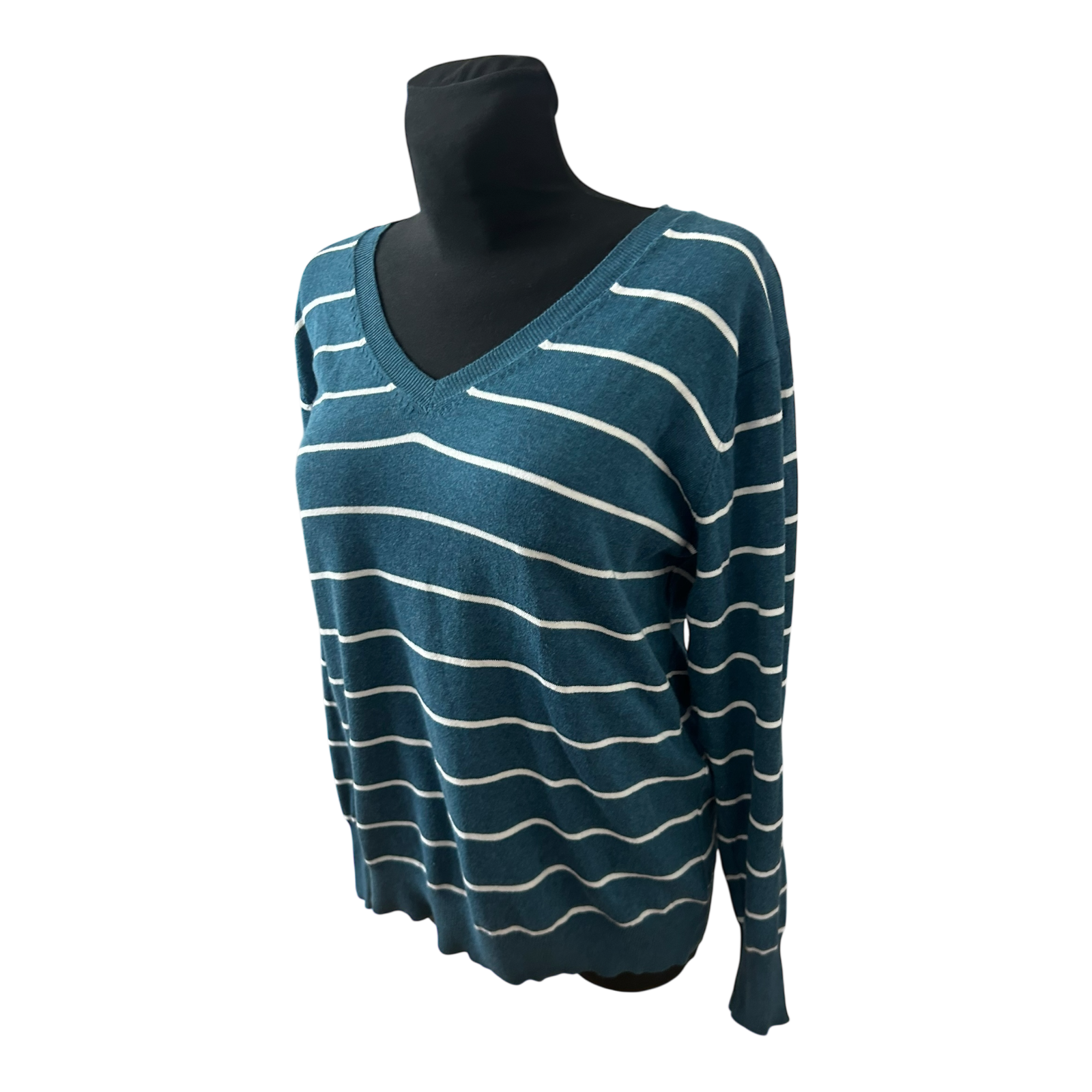 Yessica Damen Pullover XL Petrol Weiss Gestreift V Ausschnitt Feinstrick