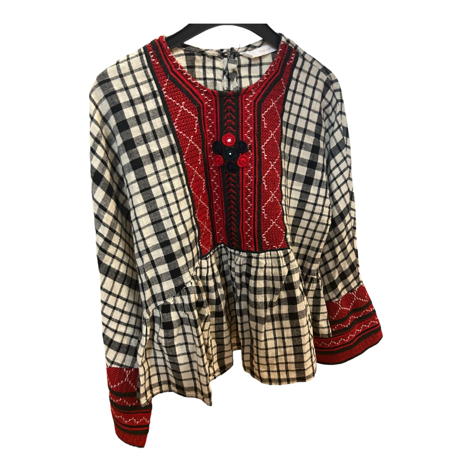 Diese besondere Zara Bluse in Größe M vereint traditionelle Muster mit modernem Design. In kräftigem rot-weiß-blauen Karomuster und mit liebevollen Details wie Zierknöpfen und feinen Biesen ist sie ideal für alle, die einen individuellen, stilvollen Look suchen.