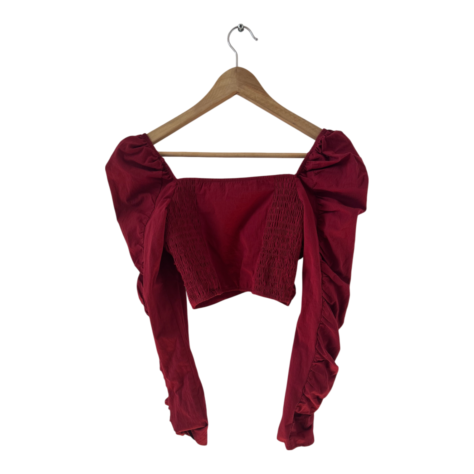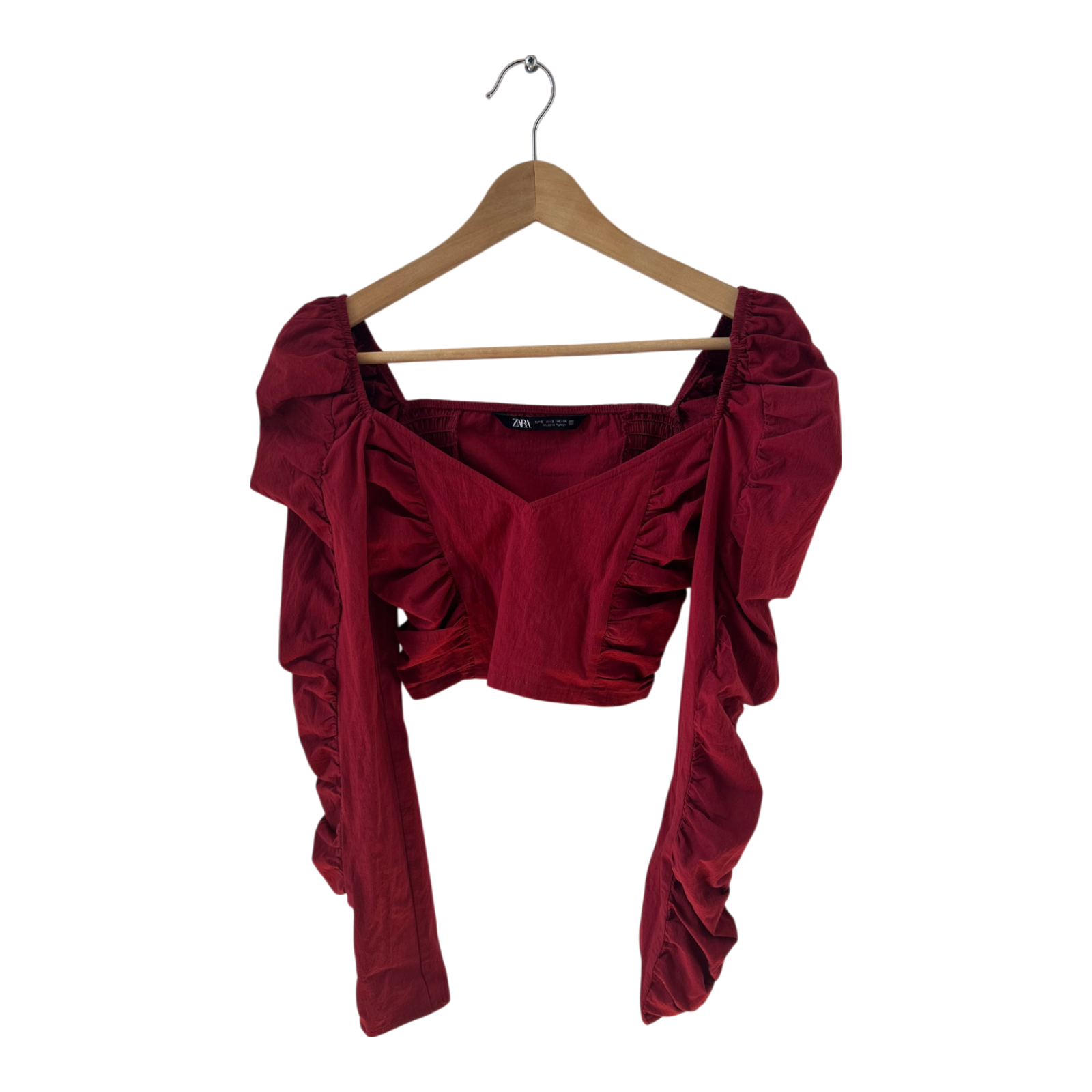 💃 Dieses bauchfreie Rüschen-Top von Zara in Größe S ist ein echter Eyecatcher für Partys, Events oder trendige Streetstyles. Die intensive bordeauxrote Farbe, der Carmen-Ausschnitt und die langen, gerafften Ärmel machen das Design romantisch, feminin und gleichzeitig modern.